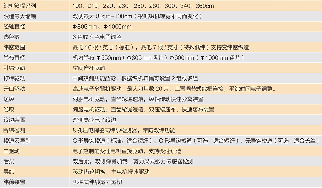 該機最高設計轉速750R.P.M ( T190),適應于棉、混紡等纖維的織造,尤其適合于高品質(zhì)要求的服裝面料、牛仔布、色織布等織物的織造。